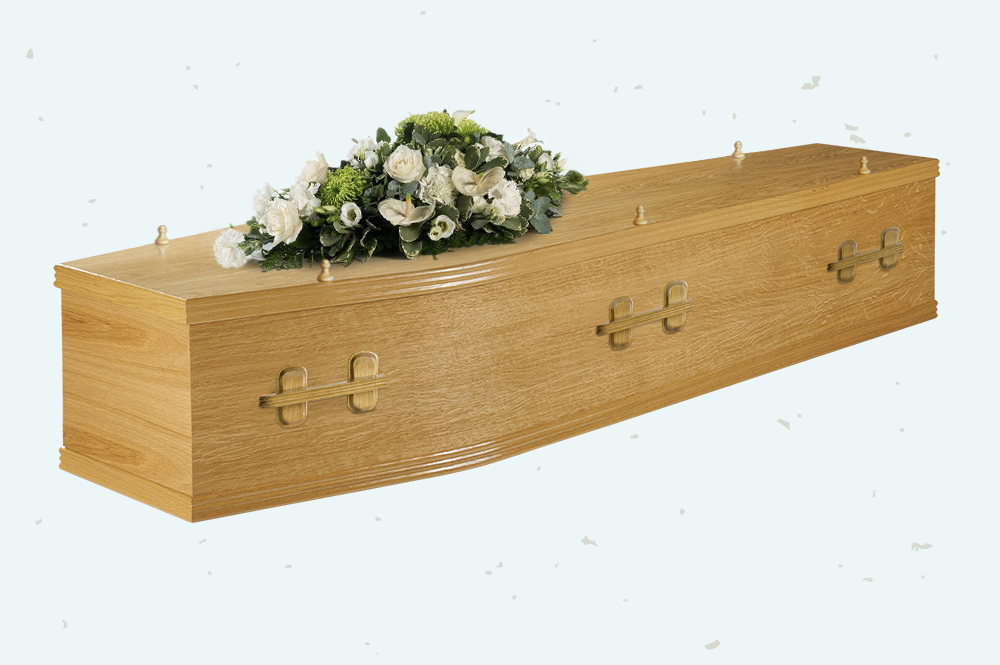 A polished oak veneer coffin with silver or gold-effect furnishings, optional corner clips, ‘At Rest’ plate, rose, flat lid and plain sides. A satin interior with mattress, pillow and matching flounce.